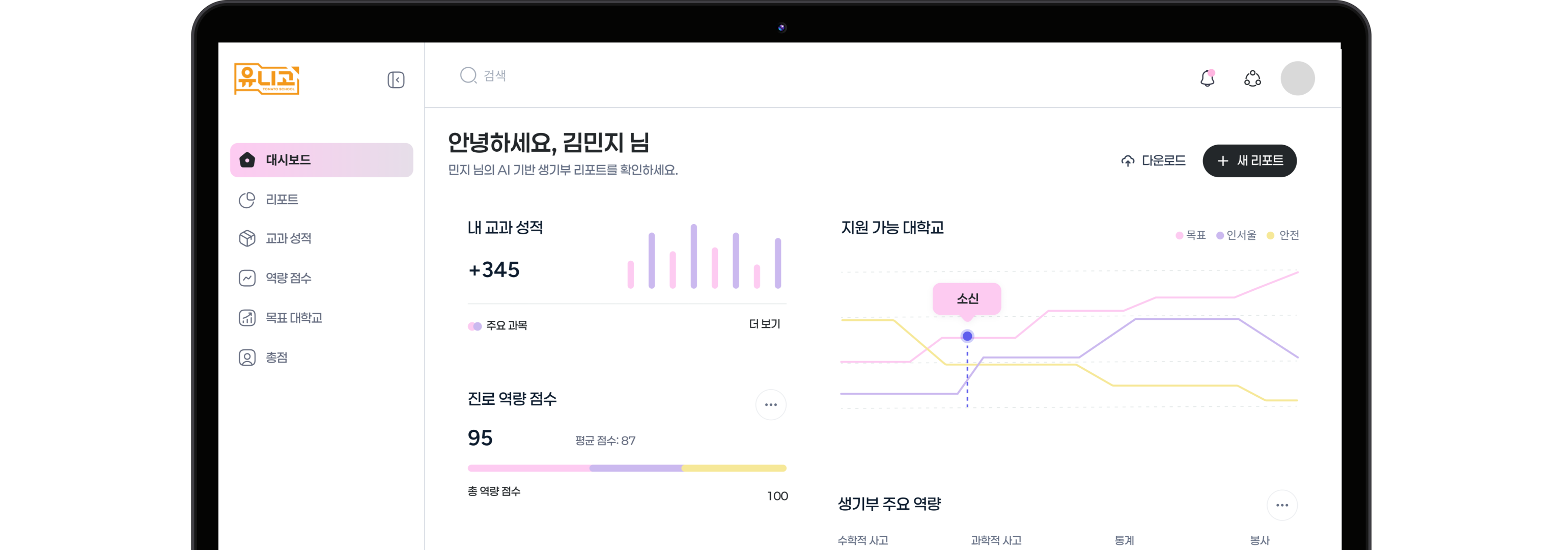 학년별 과목별 내신 성적과 주요 대학의 교과 반영 비율을 비교해, 강점 과목과 보완이 필요한 과목을 한눈에 파악할 수 있도록 시각화된 리포트를 제공합니다.